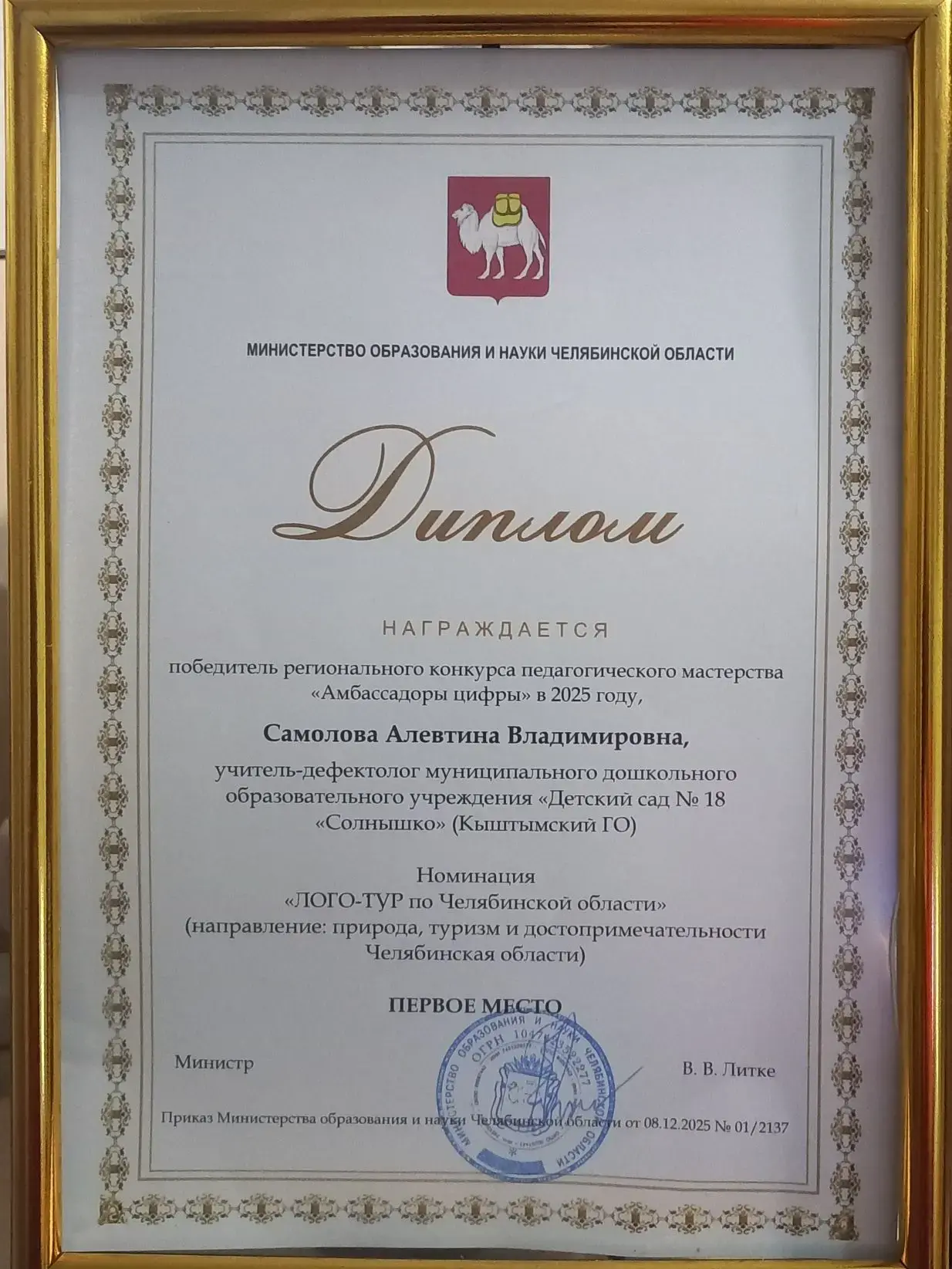 В период с 13 октября по 10 декабря 2025 года прошёл региональный конкурс профессионального мастерства педагогических работников "Амбассадоры цифры", организатором которого является Министерство образования и науки Челябинской области. Конкурс проводился с целью популяризации и обобщения регионального опыта использования подсистем федеральной государственной информационной системы "Моя школа", информационно - коммуникационной платформы "Сферум", сервисов "Цифровой помощник ученика", цифровых ресурсов в дошкольном образовании, стимулирования профессиональной активности педагогов, развития творческого потенциала и повышения профессиональной компетентности педагогов. Конкурсные работы оценивал экспертный совет в состав которого вошёл учитель - дефектолог, нашего детского сада - Зель Юлия Сергеевна, а активным участником стала учитель - дефектолог Самолова Алевтина Владимировна. 32 педагога дошкольного образования из разных городов области ( Челябинск, Магнитогорск, Карталы, Южно - Уральск, Златоуст, Миасс, Аша, Трёхгорный, Сатка, Верхний Уфалей, Пласт, Коркино, Сосновский МР) выполняли конкурсное задание " ЛОГО - ТУР по Челябинской области", представляя свою авторскую методическую разработку дидактической игры по ознакомлению дошкольников с малой родиной с использованием программируемых логороботов. Экспертный совет высоко оценил конкурсную работу "Квест-игра «Природный комплекс Сугомак» Самоловой Алевтины Владимировны, отметив: методическую и психолого-педагогическую грамотность, корректность и глубину понимания предметного содержания, убедительность и аргументация предлагаемых педагогических решений, инновационный подход к решению поставленной задачи. Результат педагогического труда стала ПОБЕДА (1 место)!